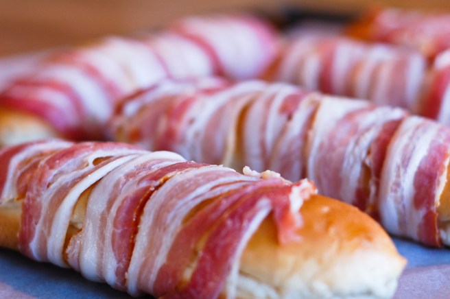 Hitið ofninn i 225°. Smyrjið pylsubrauðið með rækjusmurosti og vefjið beikoni utan um það. Reiknið með 3-4 beikonstrimlum á hvert pylsubrauð. Ég var með 10 pylsubrauð og notaði nánast heilt box af rækjusmurostinum. Raðið fylltu pylsubrauðunum á ofnplötu og bakið í ca 15-20 mínútur eða þar til beikonið er tilbúið. Berið fram með góðu salati.