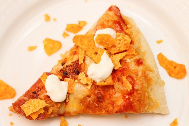 Fletjið pizzabotninn út og smyrjið hann með rjómaosti. Setjið salsasósu og rifinn ost yfir. Setjið þá pepperóni yfir ostinn, grófmyljið Doritos yfir og setjið að lokum smá rifinn ost yfir allt. Bakið í funheitum ofni þar til osturinn er bráðnaður. Setjið doppur af sýrðum rjóma yfir og berið strax fram, jafnvel með smá auka Doritos til að mylja yfir.