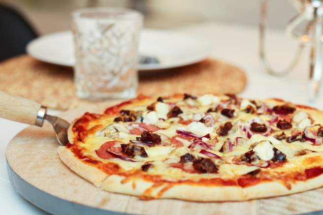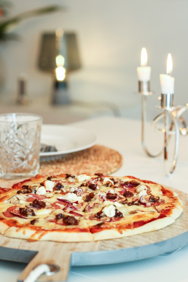 Á morgun er loksins föstudagur og það passar alltaf jafn vel að fagna helgunum með pizzu. Eðlupizzan sem ég setti hingað inn um daginn var mjög vinsæl en núna ætla ég að stinga upp á föstudagspizzu sem er ekki síðri. Það var vinnufélagi minn sem benti mér á að setja döðlur á pizzuna og eftir að ég prófaði það er varla aftur snúið. Svo klikkaðslega gott!!