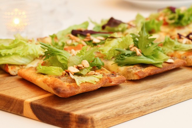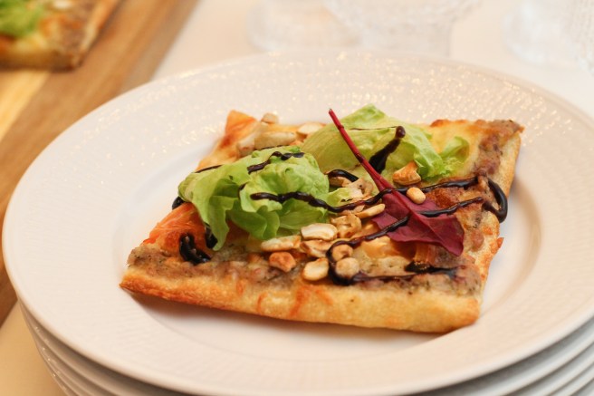 Fletið deigið út og setjið kúrbítssósuna yfir botninn (geymið sósuna sem verður afgangs í kæli eða notið hana yfir pizzuna eftir að hún kemur úr ofninum). Setjið ost og tómata yfir sósuna. Bakið pizzuna við 230° í um 10 mínútur. Þegar pizzan kemur úr ofninum er salat og hnetur sett yfir hana. Berið fram með balsamik gljáa og/eða því sem eftir var af sósunni.