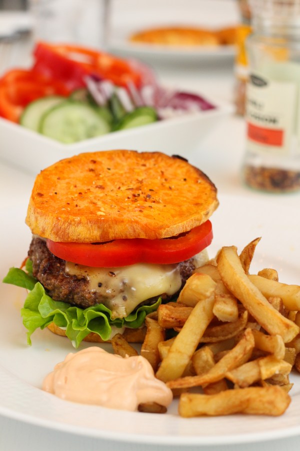 Um daginn var eitt af þeim kvöldum sem þau sáu um matinn og hann varð svo æðislega góður að ég má til með að deila uppskriftinni… eða réttara sagt hugmyndinni. Það er nefnilega alveg frábært að skipta hamborgarabrauði út fyrir sæta kartöflu, eins og þau gerðu. Þau skáru sætu kartöflurnar í þykkar sneiðar, pensluðu þær með olíu og krydduðu með maldonsalti, svörtum pipar og chili explosion. Kartöflurnar voru síðan bakaðar við 180° þar til mjúkar í gegn. Hamborgararnir voru síðan steiktir (líka gott að grillla þá!) og svo voru herlegheitin borin fram með hefðbundu meðlæti. Klikkgott!