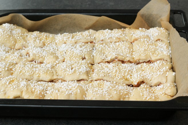 Fletjið deigið út og smyrjið fyllingunni yfir. Brjótið deigið saman, þannig að það verði þrjú lög af deigi, og leggið í ofnskúffu sem hefur verið klædd með bökunarpappír. Mótið deigið þannig að það fylli út í ofnskúffuna. Skerið göt efst í deigið og skerið síðan út passlega stóra snúða. Látið snúðana hefast í 30 mínútur. Penslið þá með upphrærðu eggi og stráið perlusykri yfir. Bakið við 200° í 17-20 mínútur í neðri hluta ofnsins. Látið snúðana kólna aðeins áður en þeir eru teknir í sundur.